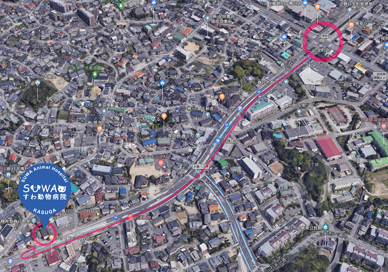 アクセスマップ お車でご来院の場合 ・県道56号線(春日横断通り)沿い ・宝町の交差点と昇町の交差点の間にあります ・病院前に駐車場5台、第2駐車場に5台、計10台完備 公共交通機関でご来院の場合 ・西鉄バス「小倉」バス停より徒歩5分 ・春日市コミュニティバスやよい「大谷2丁目」バス停降りてすぐ ・JR「春日駅」より2km 〒816-0824 福岡県春日市小倉2丁目149-3 診療時間 / 午前 9:00 – 11:30 午後 16:00 – 18:30 (日・祝は午前のみ) *診療受付(アプリにて)は午前は11:15、午後は18:15まで 休診日 / 火曜・日曜午後・祝日午後 TEL / 092-585-0012(ワンニャン) 月 火 水 木 金 土 日/祝 午前 9:00 – 11:30 ○ / ○ ○ ○ ○ ○ 午後 16:00 – 18:30 ○ / ○ ○ ○ ○ /