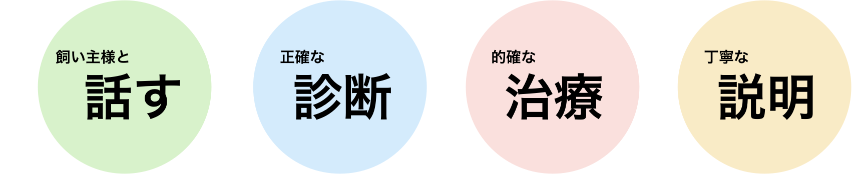 ごあいさつ 飼い主様とそのご家族であるペットの気持ちに寄り添える 地域に根ざした動物病院を目指し、 福岡県春日市に開院いたしました。 少しでも皆様のお役に立ちたいと思っております。 病気のこと、予防のこと、生活のこと、 どんな些細なことでもお気軽にご相談ください。 明るく元気な病院づくりを目指します。 どうぞよろしくお願いいたします。 診療方針 「的確な治療」を行うためには、まず最初に「正確な診断」を行うことが重要です。そのためにどんな検査が必要かなどをしっかりとご説明し、飼い主様の納得の上で診断・治療を行っていきます。「老齢だから寿命」ではなく、なにか一つでも大切なご家族のためにできることはないか、を一緒に考えます。 またひとつひとつのご家族に合った治療方針をしっかりと話し合い、できる限り多くの治療選択肢を提示いたします。「押し付ける 」のではなく、「一緒になって考える」、そのために普段からのコミュニケーションを大切にします。ご家族の不安を少しでも減らせるよう努力します。 院内設備のご紹介 受付 天井が高く自然光の入る明るい待合室です。 駐車場 病院前に5台駐車可能です。 待合室 医療機器のご紹介 全自動血球計数器 超音波診断装置 内視鏡検査機器 手術室 血液化学自動分析装置 顕微鏡 電気メス 入院室 小動物専用X線診断装置 血液凝固分析装置 オートクレーブ ガス滅菌器
