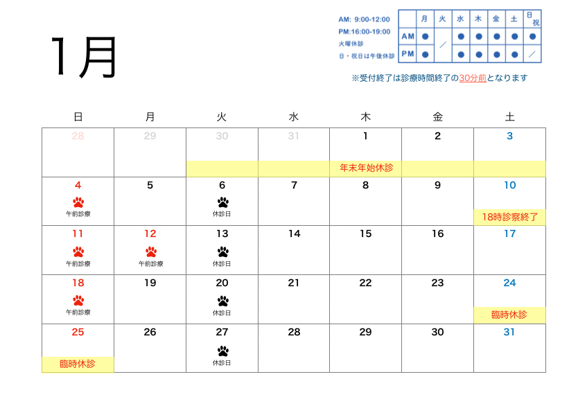 1月の診療時間のお知らせ
